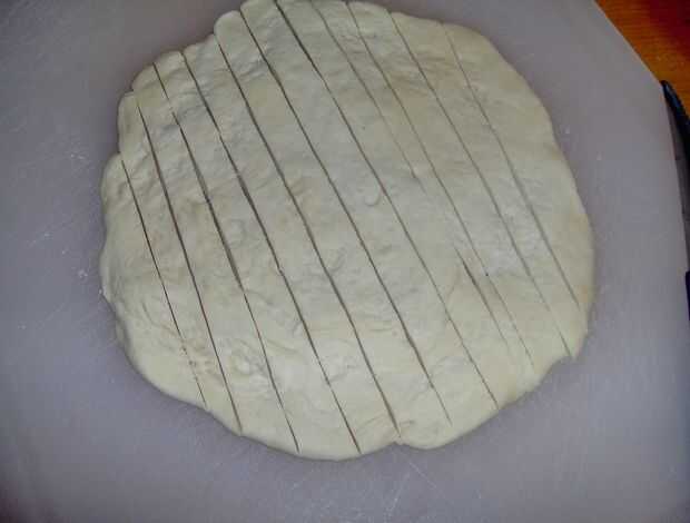 Tomar un cuchillo y dividir la masa en tiras largas sobre una pulgada a la mitad una pulgada de ancho. Te recomiendo las tiras más finas, pero es más difícil para lograr este efecto de "enrejado" cuando están más delgados.