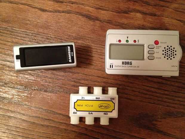 En la foto a continuación están dos afinadores eléctricos diferentes y un sintonizador de boca. El afinador eléctrico es el mejor para afinar. No pasará de afinar como un sintonizador de boca o piano puede. Si le sucede que tiene un iPod touch o iPhone, puedes adquirir una aplicación gratuita diapasón.