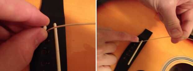 El primer paso en la fijación de las cuerdas nuevas es Inserte el extremo moldeado de la nueva cadena en el orificio del pasador de puente. Inserte una pulgada o tan de la cadena, luego inserte el perno de puente con la ranura hacia el cuello de la guitarra. Sostenga el perno de puente hacia abajo y tire la cadena hasta que se detenga, indicando que el grano ahora es atrapado contra el pasador.