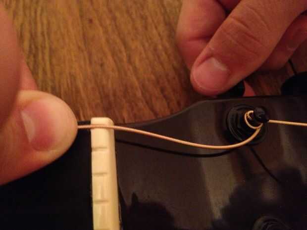 Gire el cabezal de la máquina para enrollar la cadena alrededor del perno. Al observar la cara de la pala, los pernos deben ser girando hacia la izquierda para las tres cuerdas más bajas y a la derecha para las tres cuerdas superiores. Es importante mantener la cadena de la sintonización pin enseñado así la cadena bobinas firmemente alrededor del perno. Apriete hasta que no esté en la cadena. La cadena debe hacer tres o cuatro vueltas alrededor del perno.