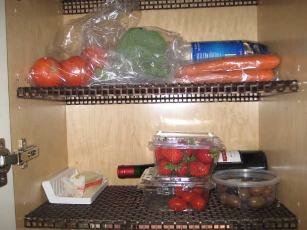 Hemos estado guardando huevos, mantequilla, aceites, mantequilla de maní, manzanas, cebollas, tomates, brócoli, cilantro, perejil y fresas en su interior. Resulta que tenemos tanta comida en la nevera que hay suficiente espacio en la nevera pequeña para el resto. Ni siquiera es un problema - nuestra vieja nevera siempre estaba más lleno de comida que es.
