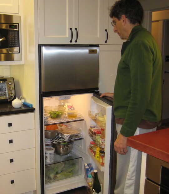 Nos comprometimos a comprar una nevera muy pequeña al principio de la remodelación de la cocina. Este refrigerador tiene 10,3 pies cúbicos de volumen, en comparación con el 16,6 pies cúbicos de nuestra vieja nevera. Mientras que progresó la remodelación de la cocina, a veces tenemos pies fríos. "¿Qué haremos si no funciona el refrigerador de California y tenemos para toda nuestra comida en esa nevera pequeña?"