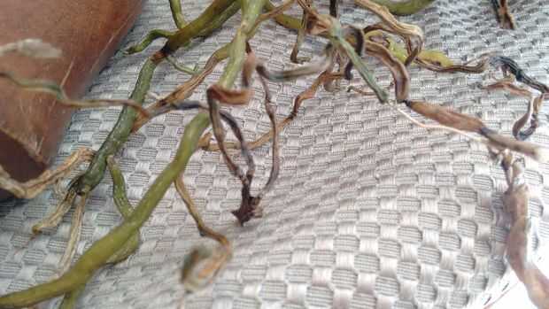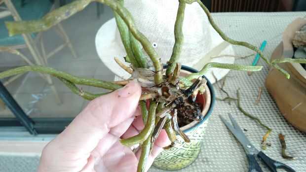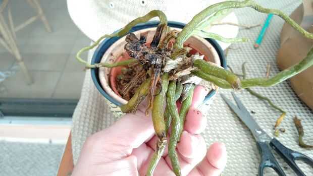 Las raíces de la orquídea no tienen que ser verde para ser viable - pálidas raíces marrón verdes o ligeras que pueden parecer un poco material de cactus son buenas dejar en su lugar.
