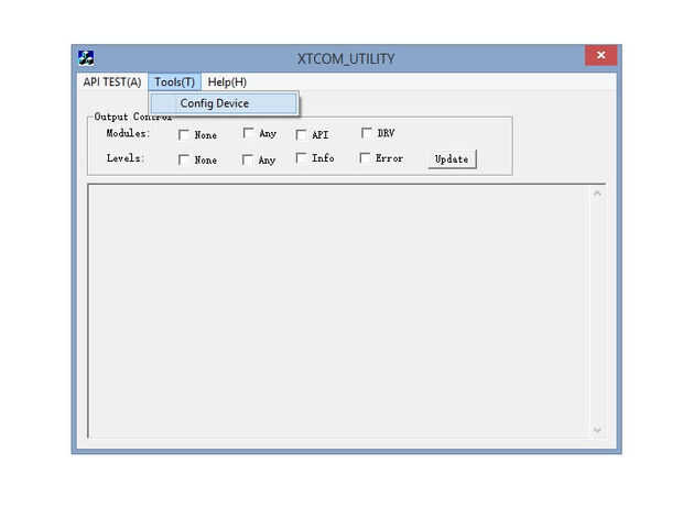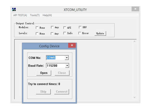+ poder dispositivo y lanzar el xtcom_util.exe, seleccione Herramientas > configuración de dispositivo y seleccione el número de puerto del dispositivo. 115.200 baudios es aceptable en la mayoría de las placas.