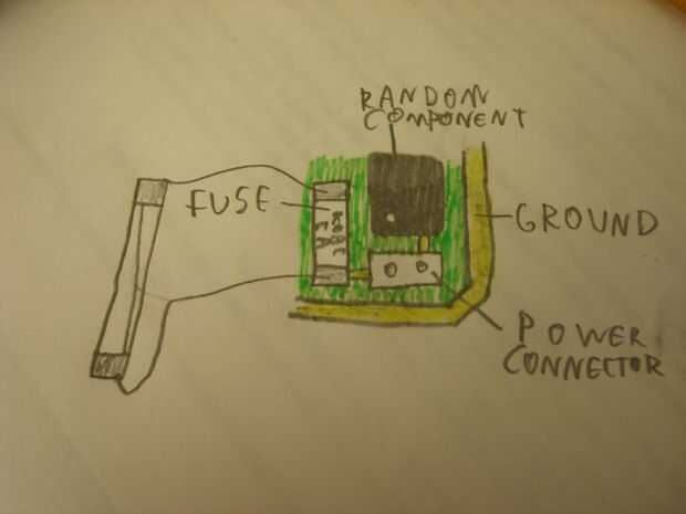 En primer lugar, la soldadura o de lo contrario Fije los cables a ambos extremos del fusible fundido. Esto puede ser difícil, pero ser persistente. Podría eliminar la soldadura y sustituirlo por uno idéntico, pero no tiene ningún sentido; Esto funciona igual de bien. Ahora Conecte los otros extremos de los cables a los extremos del fusible nuevo; Usaba pinzas fusible metal pequeño, pero podría simplemente enrolle los cables alrededor de los extremos del fusible y cinta adhesiva en su lugar o incluso les de la soldadura en. Envuelva el fusible en cinta para que no corto hacia fuera contra cualquier cosa y colocar en un lugar conveniente en el circuito donde no ruedan alrededor de demasiado. Asegúrese de que todas las conexiones son seguras (la polaridad no importa, como un fusible es básicamente un alambre) y cerrar el cubo hacia arriba otra vez; Conecte todo en, snap [y atornille completamente las Asambleas atrás, etcétera, etcétera. Poner detrás juntas es fácil una vez que has tomado aparte.