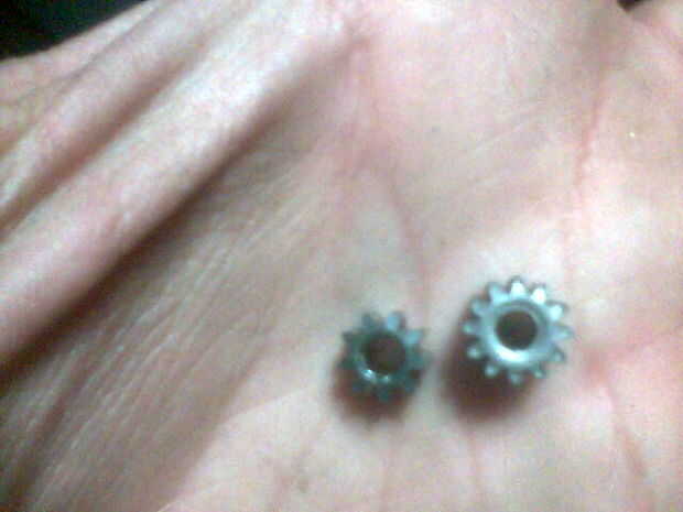 Los piñones son de distintos tamaños, así que ten cuidado en que pertenece a ellas.  Esta fotografía muestra mejor.  Acaba de poner el piñón derecho en el nuevo motor. Hacerlo suavemente, tenga cuidado de no dañar el motor.