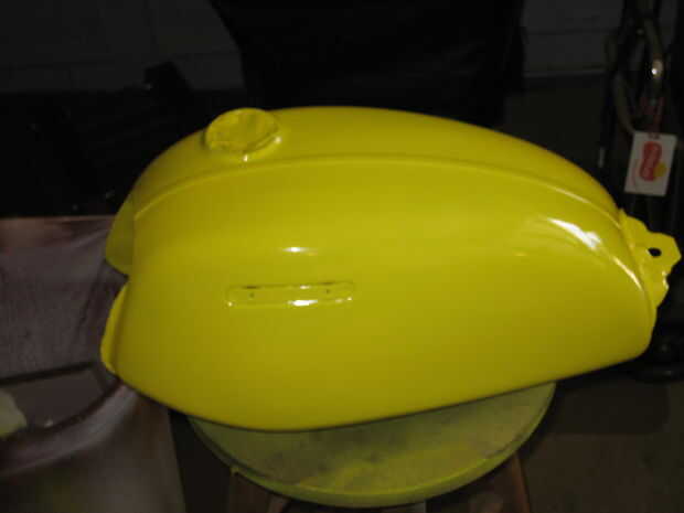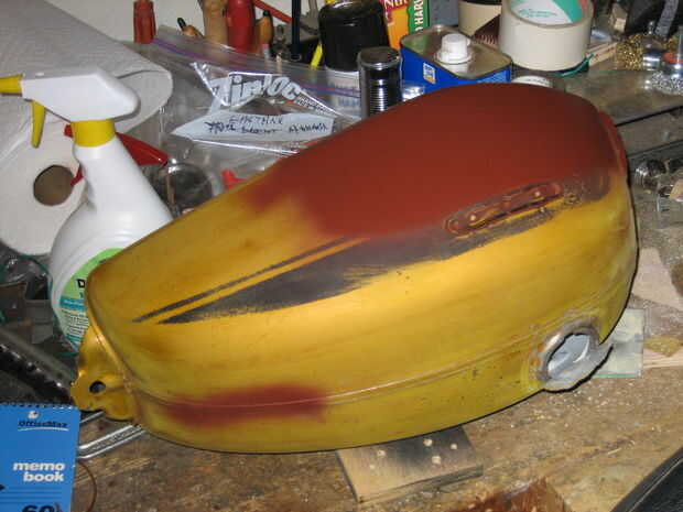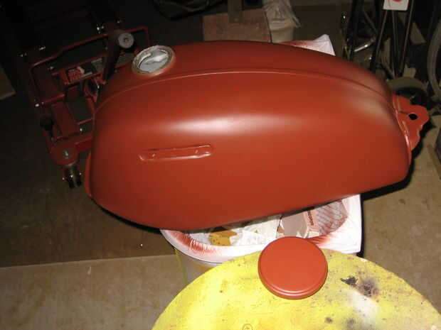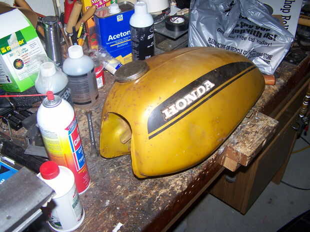 Después de cuidar de los interiores del tanque, luego comencé a trabajar en la parte que "muestra". He utilizado bondo para llenar cuatro abolladuras, cuidadosamente lijado y nivelar el relleno a las líneas del tanque. Luego apliqué imprimación, luego pintar.
