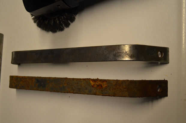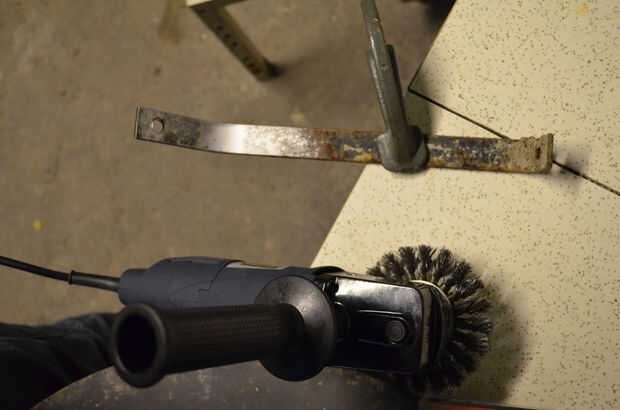 Mediante una rueda de cepillo de alambre en una amoladora de ángulo, pasar cada pieza de metal para quitar cualquier herrumbre suelta y pintura. Siempre utilice protección respiratoria, oído y ojo.