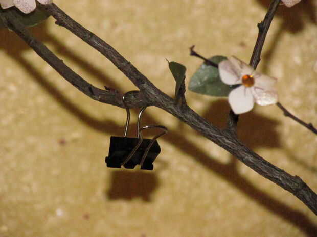 he comprado clips de oficina mini para colgar mis tarjetas. Las palancas de plata se desprenderá si se los pellizque hacia el centro de los lados. Esto hace fácil de colocar en alguna de las ramas más pequeñas. Después en la rama, firmemente Apriete otra vez que vuelva a colocar la pieza negra.