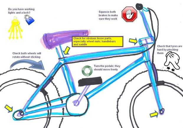 - Prestado bicicletas: cables estirada/rasgado/ajustados llantas dobladas, pinchazos, engranajes atascados, manillar torcido/loose, ruedas sueltas, marco abollada