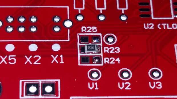 Antes de empezar a colocar los componentes en mi PCB, me gusta el cojín más correcto de cada componente SMD de la lata. Hacer el izquierdo pad más porque soy derecho. De esta manera cuando voy a colocar los componentes, puedo sujetar con unas pinzas en la mano izquierda y solo calientan la soldadura con el soldador en mi mano derecha. Esto le impide que necesitan tres manos. Cuando coloque sus ICs simétricas, asegúrese de que el indicador de un perno es realmente en el perno uno antes de soldar.