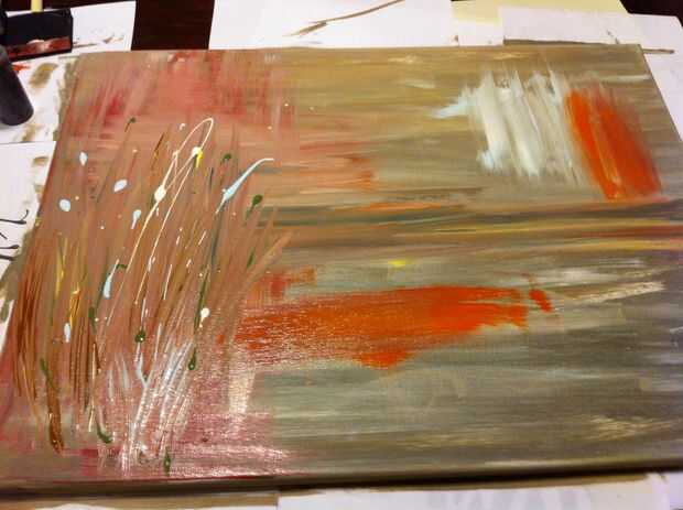 Canal Georgia O'Keefe. Tomar una copa. Pensar pensamientos felices sobre el destinatario. Tomar una pieza de calentamiento para jugar con los colores. En la foto mi lienzo de calentamiento. Utiliza los mismos colores y sobre todo averiguado qué combinaciones que hice y gustó. Tomar otra copa.
