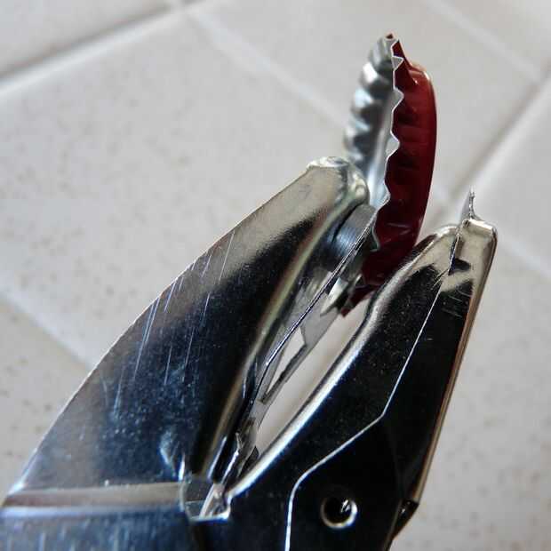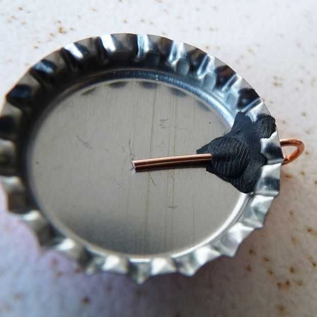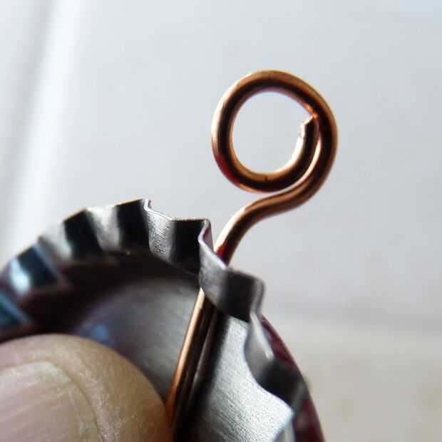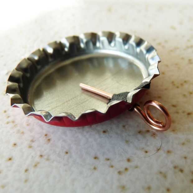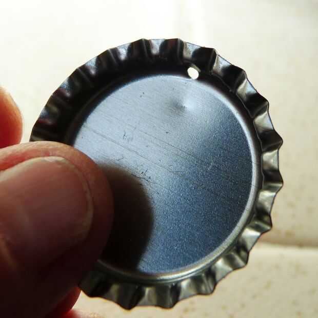 1 - hacer un agujero en el lado de la tapa de la botella limpia para que el borde termina en el interior de la tapa. El metal es suave, pero perforar cuidadosamente. Utilizar un sacador de agujero pequeño de la tienda de artesanía.