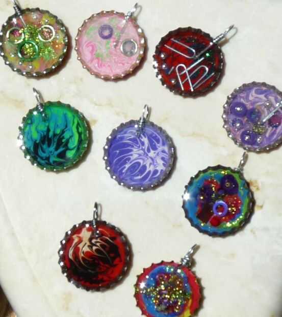 Cuando la resina está completamente endurecida, puede Agregar los resultados. Los tapones de botellas están listos para usar - algunos biseles necesitará un anillo del salto o dos. Luego simplemente añadir un cordón o cadena.