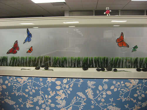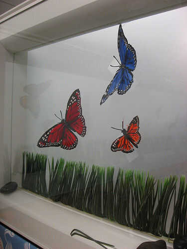 Compré la hierba, las rocas y mariposas en Michelle, probablemente todo por $10. Las mariposas que tenían alambres en la parte trasera que scotched cinta sobre el vidrio. Hojas grandes y las recibí de la sección de niños IKEA por $15 un pedazo y varios otros juguetes y cosas que he tenido durante años.