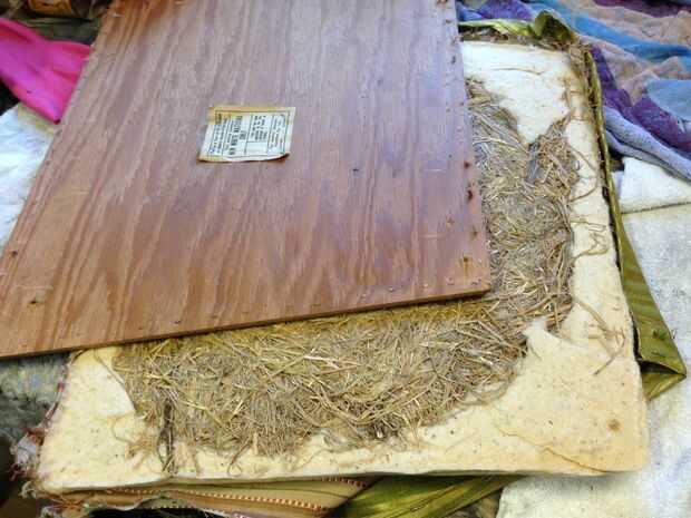 Ahora se va quitar a la tela vieja. Me pareció simplemente envoltura nueva tela justo encima de la tela existente, que sin duda es una opción, aunque esto ya había hecho varias veces y yo pensamos que la amortiguación existentes debían ser reemplazado, así que aproveché hasta la madera contrachapada. Como veis en la foto que el cojín realmente fue hecho de heno, así que estoy contento tira hacia abajo, como no es la opción más cómoda (aunque una trabajadora, este da un ejemplo de la edad de las sillas...).