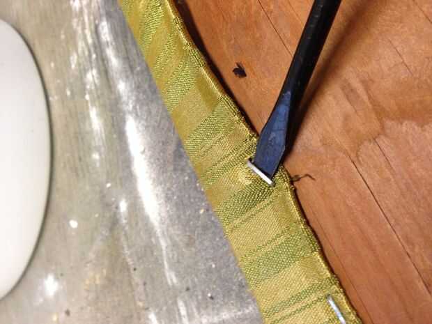 Utilizando un destornillador plano, retire todas las grapas a la tela existente. Asegúrese de que no hay más grapas o bordes irregulares restante que potencialmente podrían perforar a través de la nueva tela que una vez aplicada.