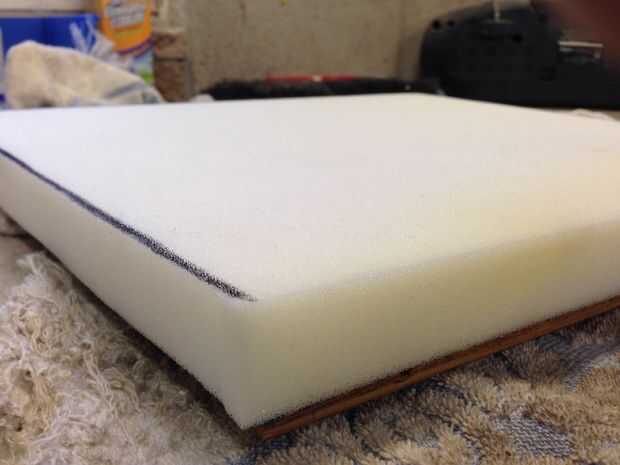 Corte, o han cortado, la espuma al tamaño correcto, utilizando la madera como una plantilla para el tamaño de forma. Corte a la tela del tamaño de la almohadilla con suficiente para 3-4 pulgadas alrededor de los lados de la proyección. Tiene que haber bastante saliente para que puedas tirar por todos lados ya que la grapa hacia abajo. Coloque a la tela sobre el asiento y darle la vuelta cara abajo para iniciar la fijación.
