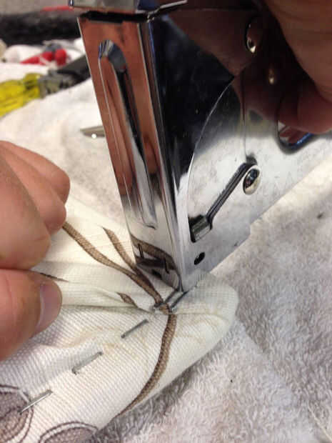 Para grapar a la tela hacia abajo, conseguir grapas que son del largo apropiado. Que quieras ser tiempo suficiente para que suficiente mantener a la tela en su lugar, pero no tan de largo que pasa por la madera y lo suficientemente alta para empujar le en el trasero! También es más fácil trabajar en una mesa contra la pared porque cuando empiezas el proceso necesita mantener la tensión en ambos lados del asiento para aplicar la presión necesaria. Para evitar las arrugas en la tela, necesitará alterar continuamente el lado que está grapado. Poner unas grapas en un lado, poner un poco en el lado opuesto, luego hacer lo mismo para el lado de adjecent. Empezar a grapar desde el medio de cualquier lado y avanzar lentamente en las esquinas. No te olvides de voltear el asiento cada cierto tiempo para asegurarse de que no tire a la tela demasiado en cualquier dirección, o que se termina con las arrugas y tener que rehacerlo. Dependiendo del tipo de madera que el asiento está hecho de que las grapas no ir todo el camino. Tiene un martillo de mano para asegurarse de que a Libra los en que no van todo el camino en. Las esquinas se pueden conseguir un poco difíciles de mantener la tensión suficiente e incluso de ambos lados, pero si tan básico a la esquina como puedas sin grapar la parte adjecent que no ha sido sujetado con grapa aún, entonces puede hacer la esquina tirando de la tela junto a uno de los lados, grapado, luego tirando el resto junto con el otro lado y colocar otra grapa en la parte superior. Un poco difícil de explicar, pero puede ver en la foto adjunta que son una pareja capas de pliegues en la esquina para hacer lo que era apenas descrito. Después de que has grapado todo, se puede recortar a la tela sobrante por lo que no ves nada colgando por debajo de la silla.