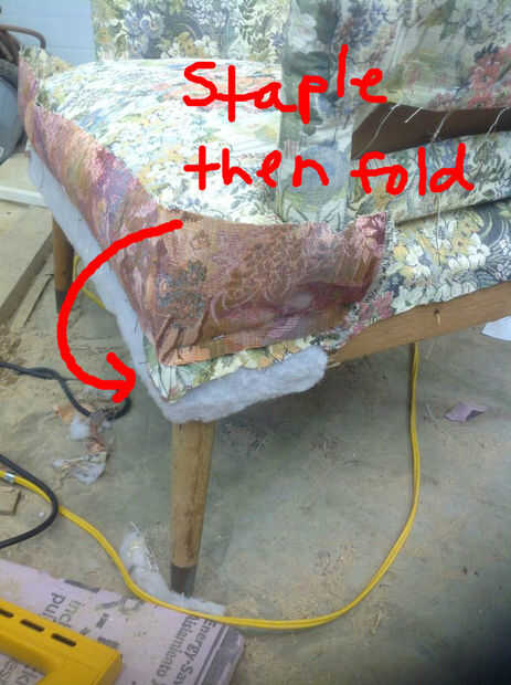 Primero, usted necesita grapar la tira inferior de la tela en la parte inferior, parte frontal de la silla. Es super facil :) A grapar la tela lado (bien juntos) y luego doblar la tela hacia abajo (que era confuso... mira las fotos). Una vez que doble a la tela hacia abajo, grapa la parte inferior de la tela en la parte inferior de la silla (como adentro debajo de la silla).