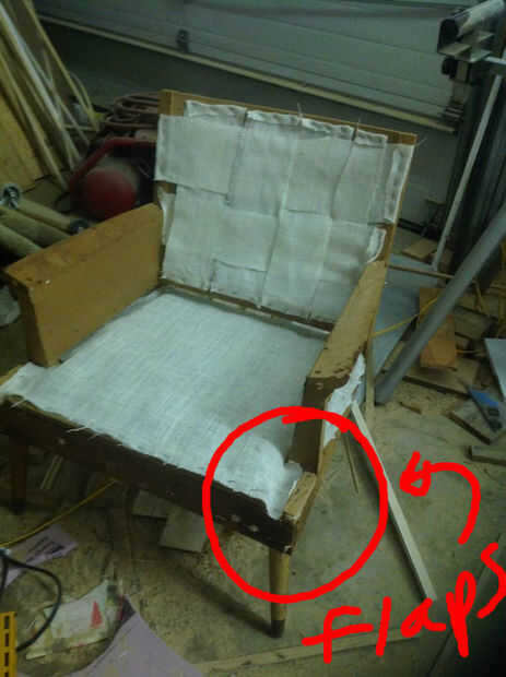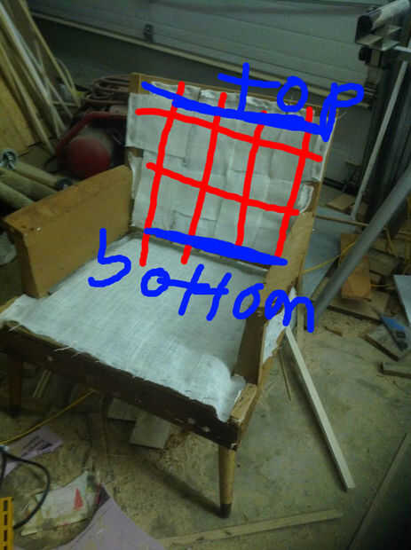 Si la arpillera en su silla es reutilizable, puede omitir este paso... Bueno, por lo que la razón la arpillera es hay que apoyar el bateo y el bateo está ahí para que la silla cómoda, así que esto es importante. La arpillera se va a cubrir la parte posterior de la silla y los resortes. Una yarda de arpillera fue suficiente para rehacer una silla. Sólo Coloque la arpillera en la parte inferior de la silla y corte la línea de salida (Asegúrese de cortar las aletas y no sólo un gran rectángulo). Utilice una pistola de grapas para fijarlo en su lugar. Para la espalda de la silla, corte tiras de arpillera aproximadamente 3 pulgadas de ancho. la espalda va a ser tejidas. Yo las grapas las piezas verticales de arpillera en primera (la parte superior y la parte inferior como en la foto). Luego tejidas en los trozos horizontales de arpillera y grapas en ambos lados. ASEGÚRESE DE QUE LA ARPILLERA EN LA PARTE POSTERIOR DE LA SILLA ES TENSO.