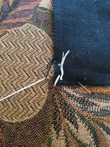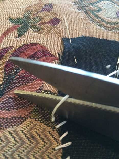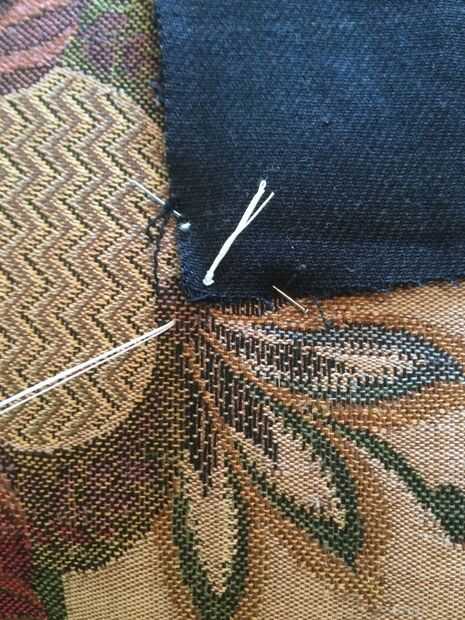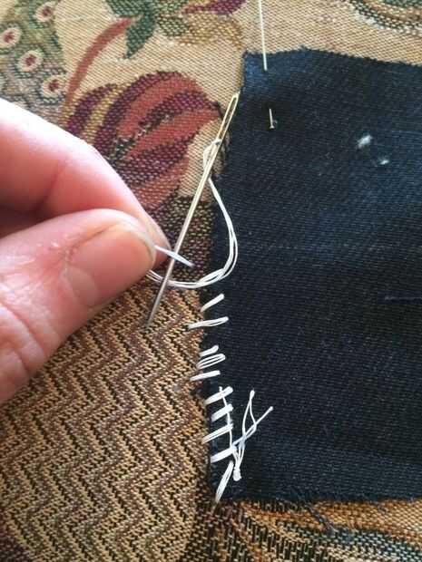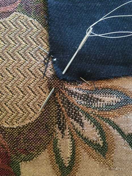 Empezar por una esquina y perforar la tela y el empuje en la tela del sofá para que la aguja penetra en el lado del parche.