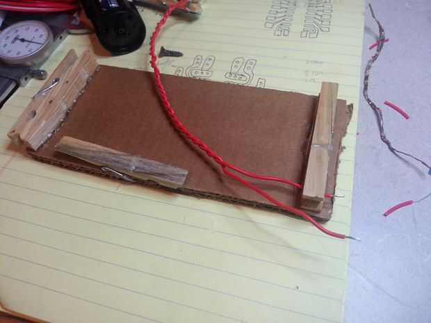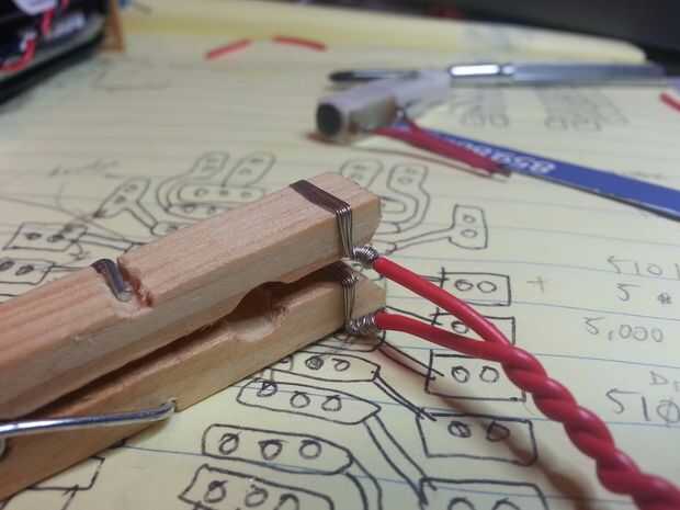 Tenemos cables para tocar cuando se cierran las mordazas de la pinza para la ropa, así que tira de una longitud de alambre multifilar y enróllelo alrededor de las mandíbulas, teniendo en cuenta la posición final del cable en relación a la posición final de la pinza de ropa en la puerta.