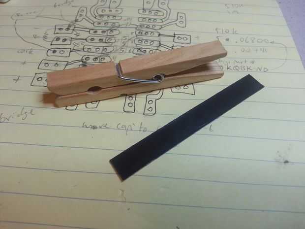 Usé un imán plano libre para sujetar la pinza a la nevera. Esto no era lo suficientemente fuerte, y usted puede tener doble, utilizar pegamento o incrustar imanes más fuertes. Habrá algún par en el lado de las mandíbulas de la pinza para la ropa en el lado de la cola es comprimido por la puerta del refrigerador, y que pueden separar su disparador de la posición deseada.