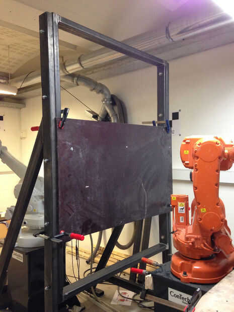 Este es un simple armazón acero para sostener hojas material orientadas verticalmente mientras se trabaja con un robot industrial. Los tamaños de los miembros pueden ser ajustados para tu escuela o robot de la organización necesidades de habitaciones y hecha más fuerte o más ligero caber. Las conexiones son ambos soldadas y atornillan y requieren soldadura mig básico y habilidades tienda de acero.