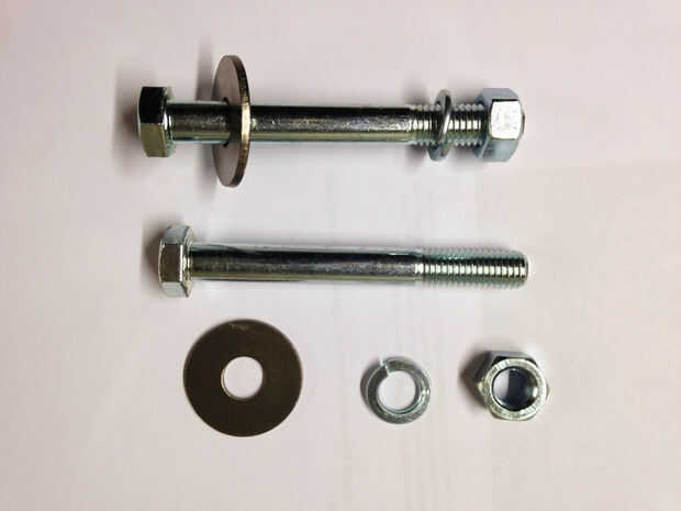 Nos empernaron el interior de las piernas con parcial rosca M12 x 100mm pernos (por lo menos 4 a cada lado). Cada perno tiene una arandela y una arandela. Que probablemente no se mueva hasta el siguiente gran proyecto, por lo que apretó abajo bastante bien con las arandelas de bloqueo.