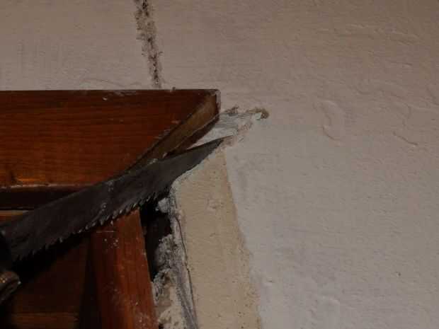 Comience marcando la zona que desea retirar y cortar el drywall. Aquí usé una sierra reciprocante con un mango y en un ángulo para cortar delicadamente las tableras de yeso sin corte en la estructura de la madera detrás de él. También corté una pequeña muesca alrededor de esta pieza de la puerta ajuste que era demasiado perezoso para quitar.