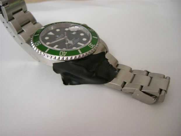 Por lo tanto, primero tenemos que preparar el reloj para evitar ralladuras. Algunos quieran quitar la pulsera, pero es innecesaria. Usted querrá colocar un trozo de cinta en una de las zapatas *, asegurando que es justo contra el bisel, pero sin cubrir el espacio muy fino entre la caja y el bisel.