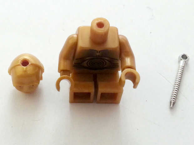 Es fácil quitar el llavero de su LEGO minifig. Después, podrás cambiar a jefes o agregar tu sombrero favorito. Todo lo que queda es una pequeña abertura donde el perno de ajuste de fricción; Esta pequeña abertura se puede rellenar con masilla de color o algún otro tipo de relleno y pintada para que coincida con.