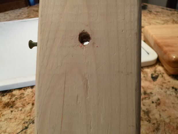 1 - el primer orificio es el diámetro de un lápiz. Hemos utilizado un 23/64", pero nada cerca debería funcionar. Este primer orificio pasa completamente a través de la madera. La ubicación es determinada por la longitud del tornillo de madera.