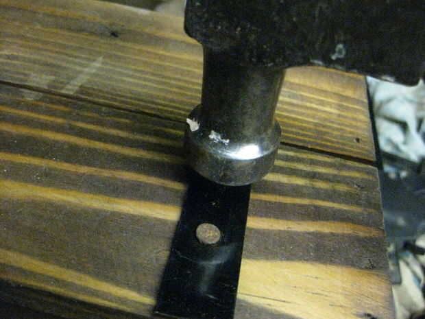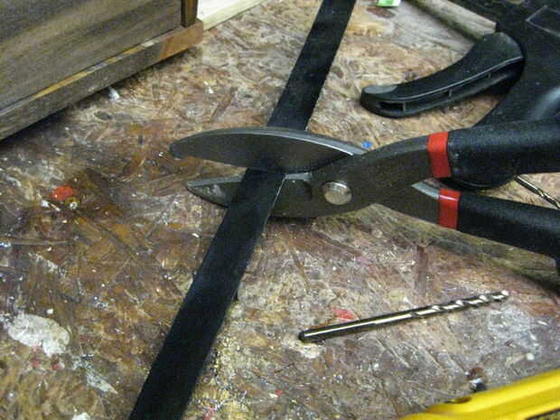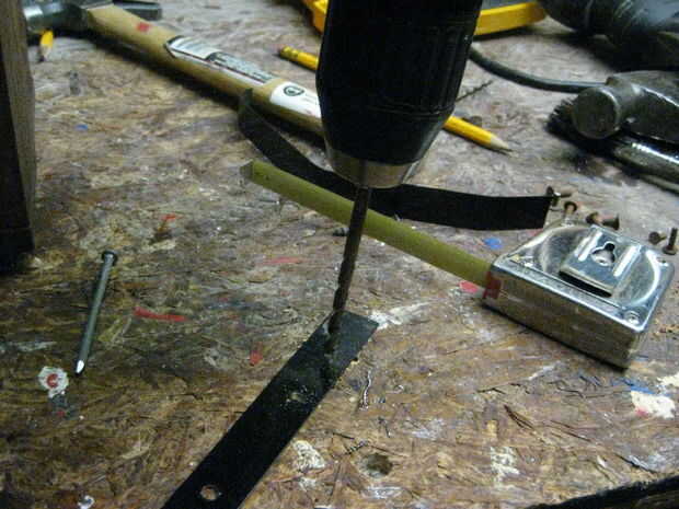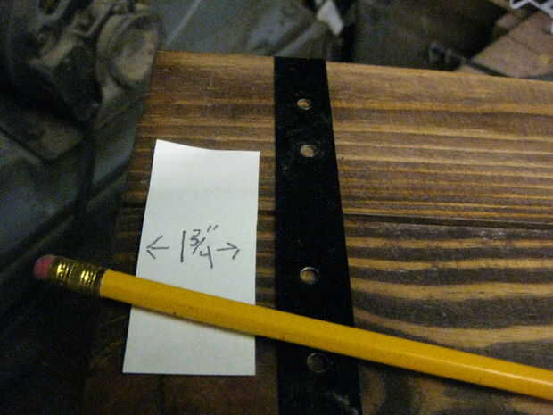 Cortar las bandas de 5 7/8" al mantener los filos claro de manos. Taladre 4 agujeros por banda en centros de 1". Usé una broca de 3/16 para esto. Coloque las bandas de 1 3/4" de los lados, luego utilice una broca de 7/64 para perforar agujeros en la madera. Pongo una parada sobre la broca para no perforar. Fría, casi terminado. Libras de clavos en.