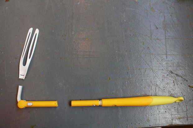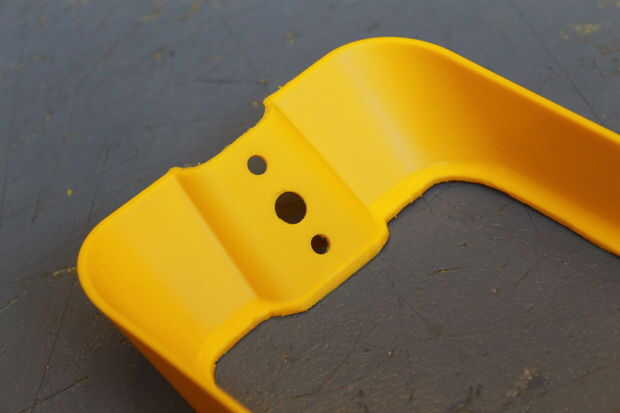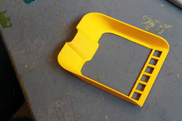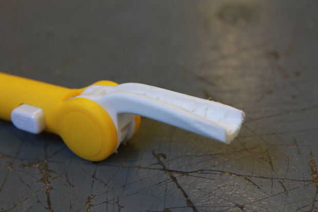 Después de Retire la manija. Porque el plástico es bastante fino, puede hacer esto con un simple cúter o utilizar una dremel. Utilice papel de lija para suavizar los filos.