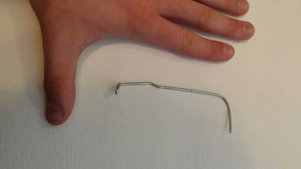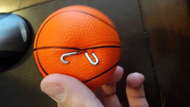 Así que yo primero había doblado tres eslabones de la cadena en esta forma de L. A continuación se empuja cada uno de ellos a través de la pelota blanda. Fui con el extremo del gancho a través de la primera. La razón dejé las muescas o salientes en el extremo es que el gancho no ir directamente a través de la bola. Sobre el ala actúa como un dispositivo para sostener la bola en el extremo del gancho.