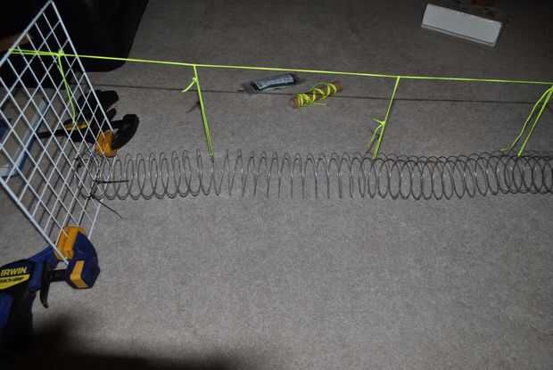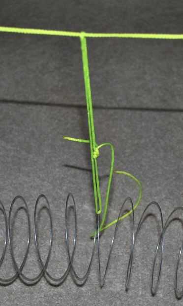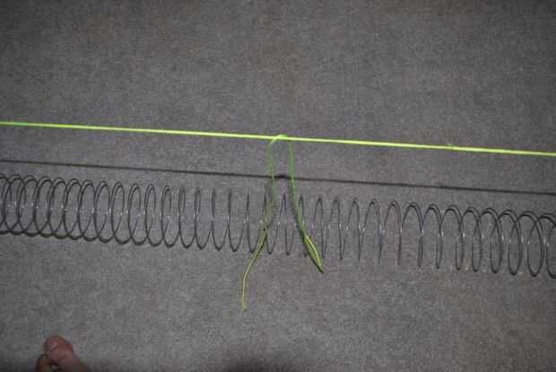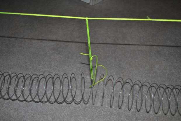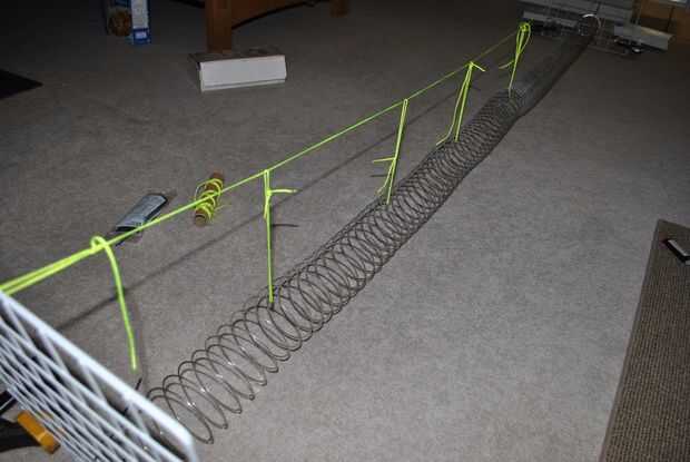 Después de la suspensión línea corre afijo lazos alrededor de la línea y la parte superior del slinky hacia abajo toda la longitud. Estos deben colocarse cada 6 a 8 pulgadas o suficiente para el furtivo de no tocar el piso cuando estén apretados. Otra vez estos deberían atados con el nudo tenso línea mencionado anteriormente para permitir un ajuste preciso de la altura.