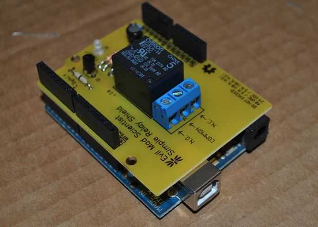 Montaje de la placa de relé se cubre muy bien en las instrucciones de la placa de relé en la página de SparkFun. Si esta placa de relé no está disponible en algún momento en el futuro simplemente busca "poder cambiar de circuito de Arduino" y surgirán muchas alternativas. Todo esto tiene que ser capaz de hacer es encender y apagado con la suficiente rapidez para activar el solenoide.