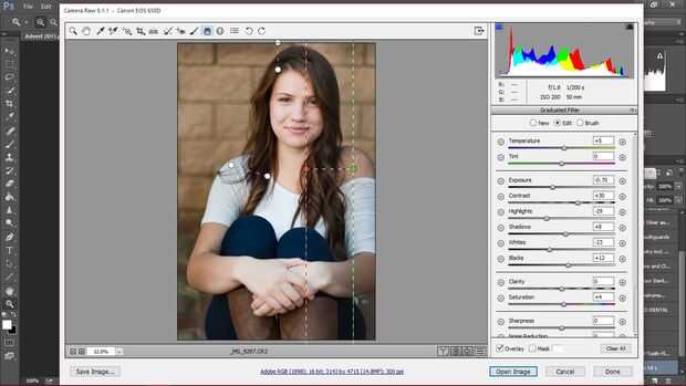9. Abra la ficha de filtro graduado asegurar que al menos un control deslizante (yo uso la exposición '-') se establece en menos de, o más