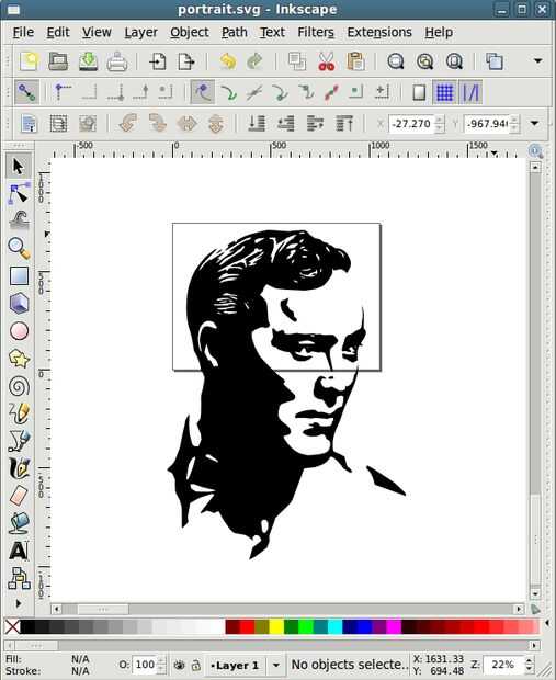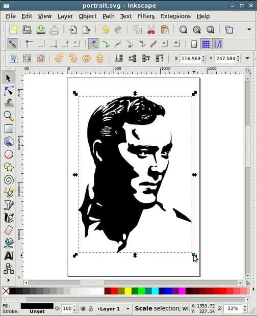 Importar la imagen pulsando "Ctrl I". Golpe "Mayúsculas + Alt + B" y "OK". Mover el gráfico vectorial creado al lado y eliminar el gráfico de píxeles. Escala la imagen al tamaño de tu lienzo, presionando "Shift Ctrl D" y ajuste de la altura y ancho. En mi caso 60 x 40 cm, mantenga pulsado "Shift" escalar uniformemente.