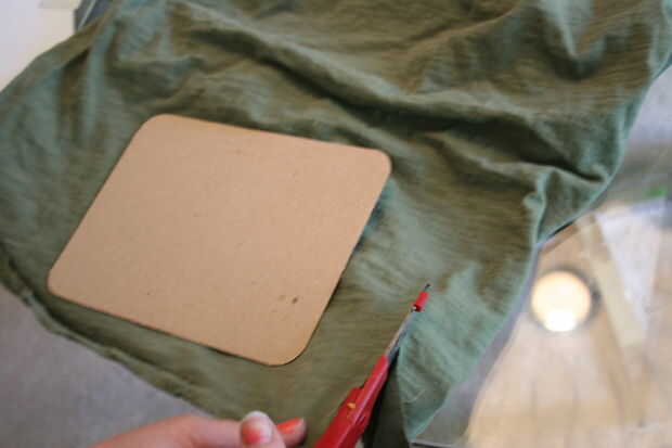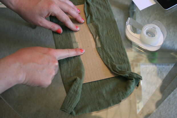 me gusta poner tela detrás del retrato. Puede Agregar un patrón o textura a la imagen. Aquí usé una camiseta con un color complementario que importaba cortar. Retire el cartón que viene en el marco y cortamos a la tela con cerca de dos pulgadas de exceso a cada lado. Luego la cinta de la tela en la parte posterior de la cartulina.