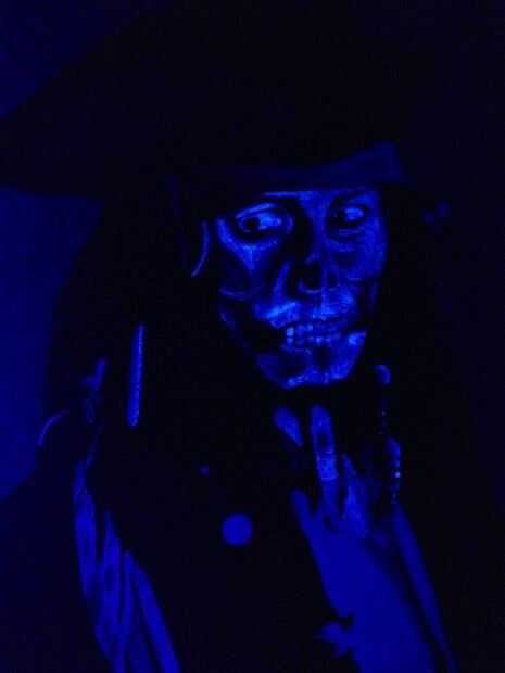 Ahora que el retrato del capitán Jack es hora de agregar un poco algo para este retrato de gato aparte de todo lo demás... Un poco azul UV reactivo la pintura! Pinté el estado maldito de Jack desde la primera película que aparece sólo en la luz de la luna. Pintaba en su rostro esquelético y accesorios que quería aparecer en el "moonlight" (luz negra) con la pintura UV. Lo bueno de esta pintura es que va en blanco lechoso y se seca totalmente claros para que durante el día el retrato de Jack ve a su ser normal y en la noche bajo la "Luna" se revela su maldición!