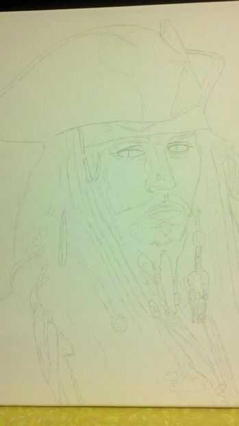 Primero compré un lienzo de 16 "x 20" y tratadas con una capa de gesso. I lija suave y trató una vez más y lija otra vez. Luego miró a través de muchas fotos de referencia diferentes de Johnny Depp como el capitán y terminó combinando unos cuantos diferentes para conseguir el visual quería. Agarré mi lápiz y saqué mi base boceto para el retrato.