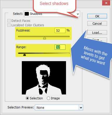 Tiempo para terminar los detalles en photoshop. Vaya a seleccionar y gama de colores. Seleccione sombras en la ventana emergente. luego del lío con los niveles otra vez para que se vea como que es un poco más agrupado.