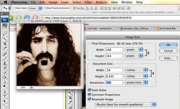 Una vez que tengas tu imagen ábralo en su editor de fotos favorito. Estoy usando photoshop, pero este tipo de edición se puede hacer fácilmente con el GIMP. Usted necesitará abrir el archivo y cambiar su tamaño a la Plaza de la anchura de la uña y la resolución a 300 al mismo tiempo. [imagen 2]
