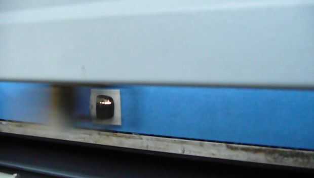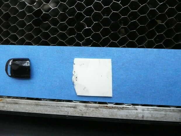 Una vez que estés listo para grabar, aplican las mismas instrucciones como en el paso 6 excepto esta vez en vez de poner la mano en el grabador del laser deberías colocar una almohadilla de doble cara cinta pegajosa acolchada en la parte superior del grabado cinta temporal, esto ayuda a la uña a permanecer en el lugar mientras la máquina vibra. Cuando envíes el archivo sobre los parámetros a utilizar son poder velocidad y 100% de 35%. Dos pasos son necesarios para obtener una buena limpia etch.