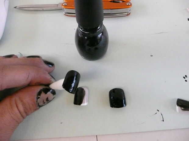 Primero debes pintar las uñas, esto es un poco más difícil porque estas uñas no están vinculadas a un cuerpo. Puede utilizar el aplicador del kit para pegarse a la parte inferior de la uña y mantenerla temporalmente que llene el clavo. Aplique dos capas y deje secar completamente.