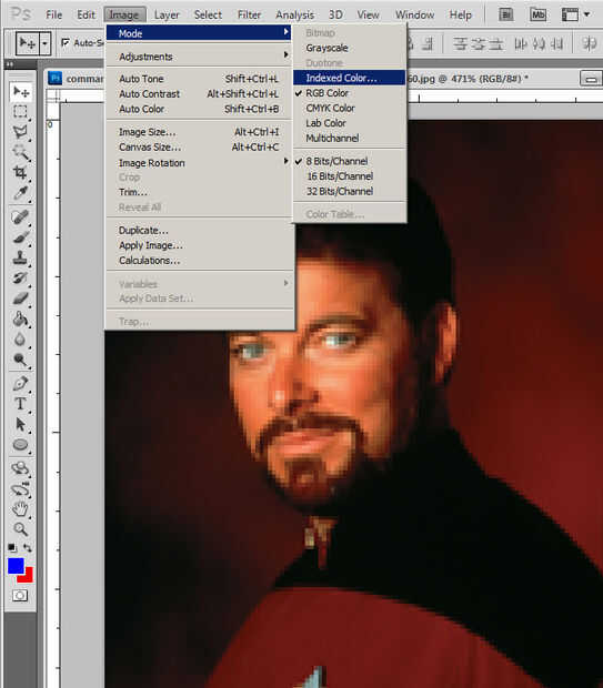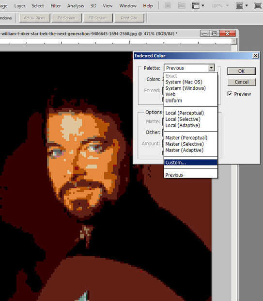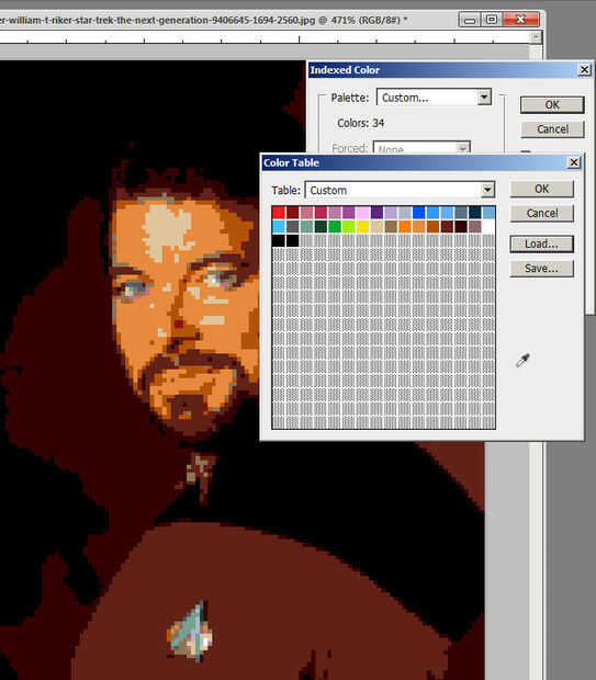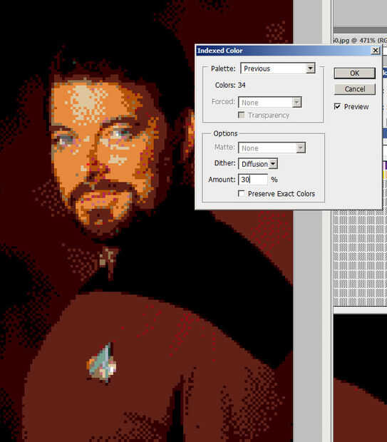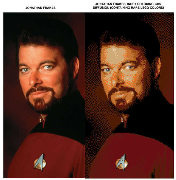 De nuevo, hacer un mosaico de video juegos es bastante fácil, como los juegos ellos mismos eran bloques y pixelado y colores primarios sobre todo contenidos. Una foto en blanco y negro es más elaborada, pero tiene una tabla de colores reducida para la fácil adquisición de piezas. Por último, con una foto a todo color convertido a 120 píxeles de ancho (120 pixeles = 120 piezas de LEGO ancho = unos tres pies de ancho) con la tabla de color de índice que contiene 33 opciones de color diferentes--cierto estándar, algunos raro--con moderada difusión. El medidor de difusión (que es opcional) controla la difusión fuera de píxeles para mantener más precisión de la fotografía base. Con índice para colorear, la imagen es literal a los colores específicos que sean aplicables; cuando con una foto a todo color de Jonathan Frakes, con sus colores reducida a 33 (y sólo unos pocos de aquellos efectivamente ser asignado), se cuenta de la imagen se ve entrecortado y pixelado como si es una imagen Gif optimizado para mal--pero, esto es lo que estamos buscando: una imagen de bloque con reducido colores! Para hacer una imagen en modo de color indexado en Photoshop, seleccione imagen > modo > Color de índice, luego en el menú desplegable superior, seleccione "Custom" y luego cargar una tabla de colores, la tabla de colores en los links de descarga abajo, que contienen los colores LEGO 33 he mencionado al principio del tutorial, de estándar a colores super raros.