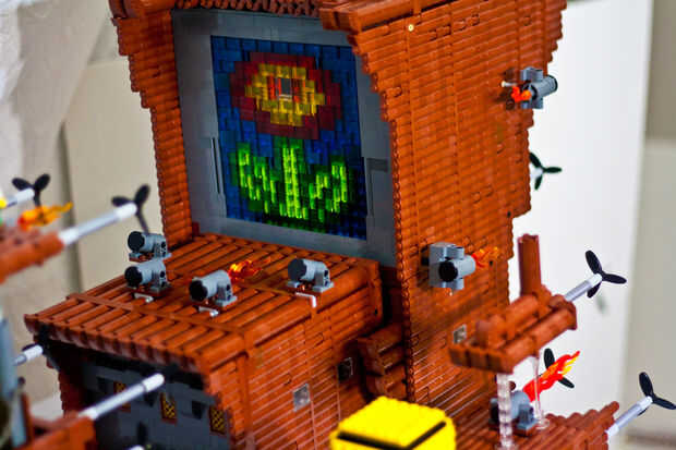 Otra vez, que una base es no obligatorio, pero muy animado si quieres tu retrato final una estructura independiente. Si desea incorporar su pared de mosaico en una estructura preexistente, como un barco o un castillo, entonces ignora este paso y simplemente siga los pasos restantes para hacer su retrato sin embargo por favor. Realmente he hecho ambos: mis retratos de mosaico encargadas por Nintendo World Store eran cuadros independientes para el caso de la pantalla, mientras que mi gigante Super Mario 3 dirigible tenía paredes de mosaico vertical para el interior de la cabina de la nave. Como puede ver en la imagen del sprite de flor fuego vitral, mosaico particular no requiere de una base, como fue integrado con la estructura de la nave sí mismo.